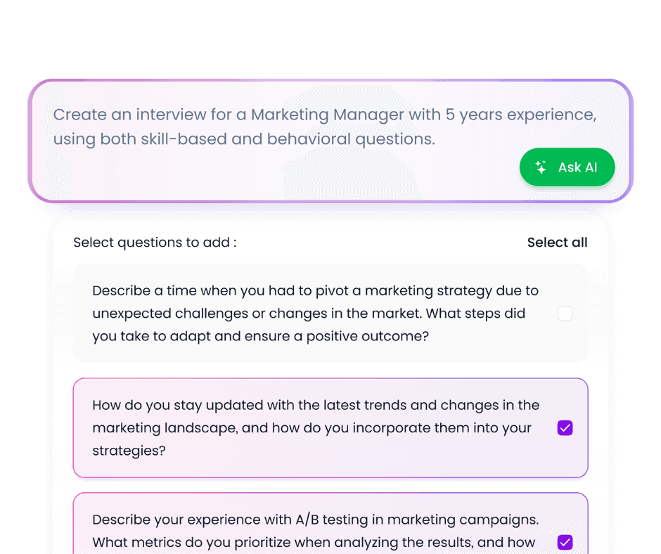 Create structured interviews in seconds using AI-suggested questions. No setup complexity and no learning curve.